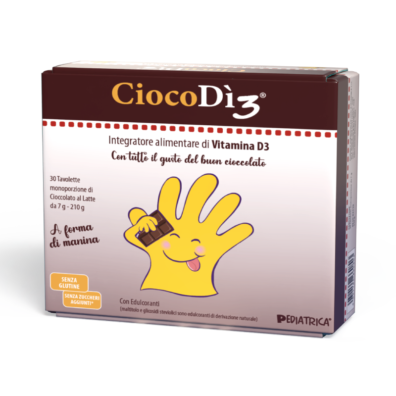Indicazioni: CiocoDì3® è un integratore alimentare a base di Vitamina D3. Il prodotto si presenta in tavolette monoporzione di cioccolato al latte 35% di cacao ed è ad alto contenuto di fibre prebiotiche (inulina ed oligofruttosio da cicoria). La Vitamina D è necessaria per la normale crescita e per lo sviluppo osseo nei bambini e contribuisce alla normale funzione del sistema immunitario. La vitamina D contribuisce al normale assorbimento e utilizzo del calcio e del fosforo.