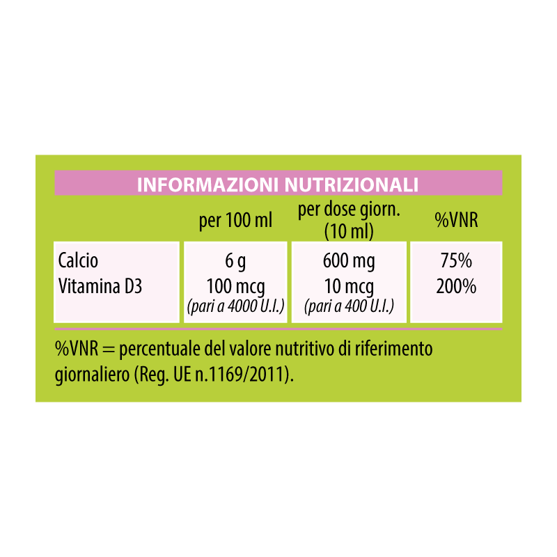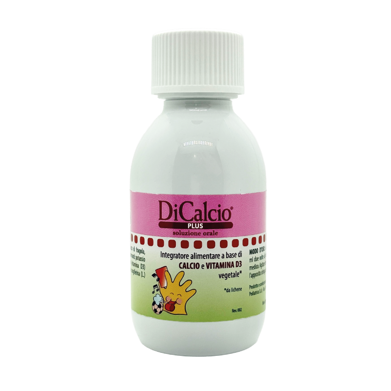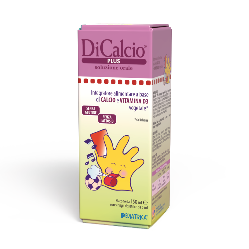 Indicazioni: DiCalcio Plus® Soluzione Orale è un integratore alimentare a base di Calcio e Vitamina D3 utile in caso di diminuito apporto od aumentato fabbisogno di tali nutrienti. Il Calcio è necessario per il mantenimento di ossa normali; la Vitamina D contribuisce a tale funzione. Il Calcio e la Vitamina D sono necessari per la normale crescita e per lo sviluppo osseo nei bambini.
