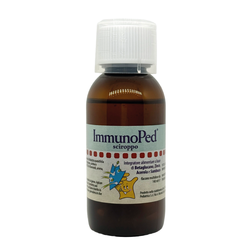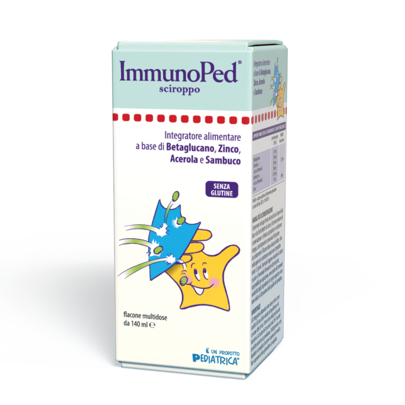 Indicazioni: ImmunoPed® sciroppo è un integratore alimentare a base di Betaglucano, Zinco, Acerola e Sambuco. Lo Zinco contribuisce alla normale funzione del sistema immunitario, l’Acerola ed il Sambuco sono utili per sostenere le naturali difese dell’organismo.