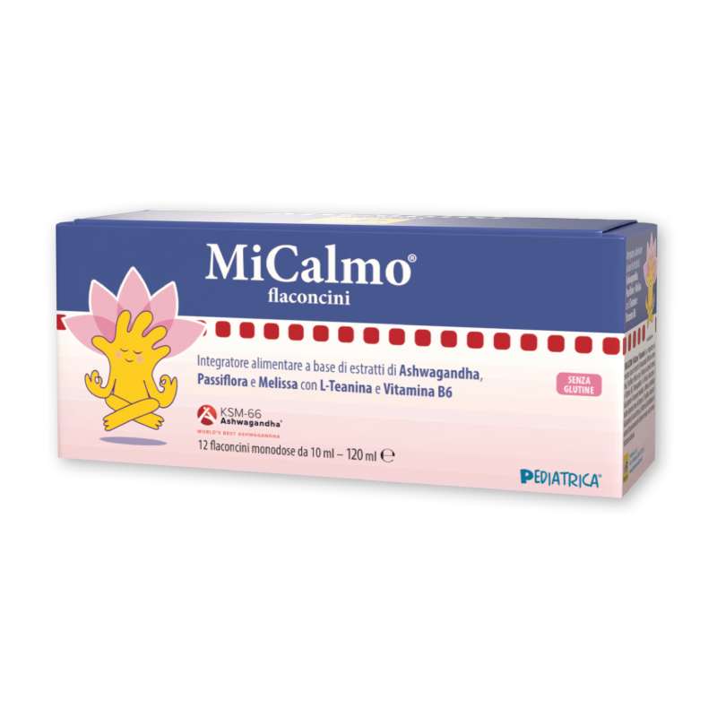 Indicazioni: MiCalmo® flaconcini è un integratore alimentare a base di estratti di Ashwagandha (Withania somnifera), Passiflora e Melissa con L-Teanina da Camellia sinensis e Vitamina B6. L’Ashwagandha e la Melissa favoriscono il rilassamento e il benessere mentale. La Melissa contribuisce inoltre al normale tono dell’umore. La Passiflora favorisce il rilassamento (in caso di stress). La Vitamina B6 contribuisce al normale funzionamento del sistema nervoso e alla normale funzione psicologica.