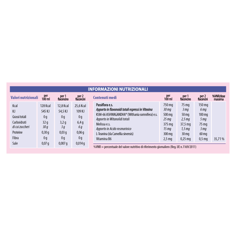 Ingredienti: Acqua, fruttosio, succo di mela, succo di carota, Passiflora erba con fiori e.s. tit. 4% in flavonoidi totali espressi in Vitexina (Passiflora incarnata), KSM-66 ASHWAGANDHA® radice e.s. tit. 5% Witanolidi (Withania somnifera), Melissa foglie e.s. tit. 4% in Acido rosmarinico (Melissa of icinalis L.), L-Teanina (da Camellia sinensis), Aromi; acidificante: Acido citrico; Conservanti: sorbato di potassio, benzoato di sodio; Addensante: gomma di xanthan; Piridossina cloridrato (Vitamina B6).