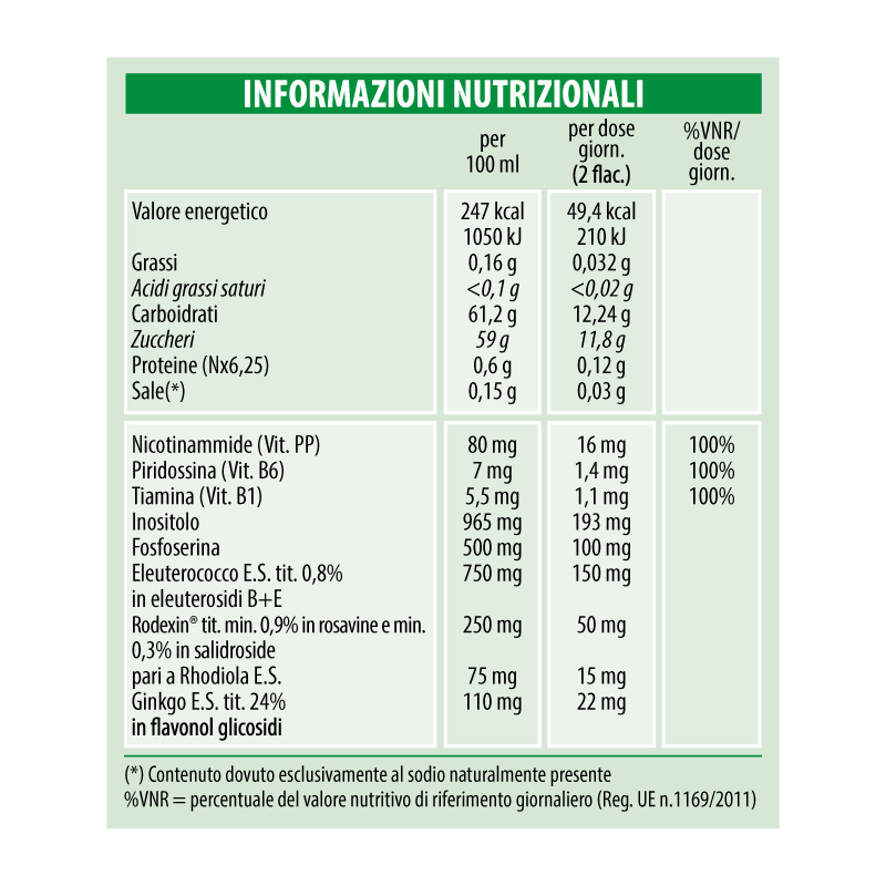 Ingredienti: Acqua, Fruttosio, Inositolo, Eleuterococco (Eleutherococcus senticosus (Rupr. et Maxim.) Maxim) radice estratto secco tit. min. 0,8% in eleuterosidi B+E (eleuterococco, maltodestrina), Correttore di acidità: Sodio lattato sol. 60%, DL-Fosfoserina, Aroma fragola, Conservante: Potassio sorbato, Rodexin® tit. min. 0,9% in rosavine e min. 0,3% in salidroside (Rhodiola (Rhodiola rosea L.) radici estratto secco, alfa-ciclodestrina, esteri di saccarosio), Ginkgo (Ginkgo biloba L.) foglie estratto secco tit. min. 24% in flavonol glicosidi (ginkgo, maltodestrina), Nicotinammide, Edulcorante: Sucralosio, Piridossina cloridrato, Tiamina cloridrato. Correttore di acidità: Acido citrico.