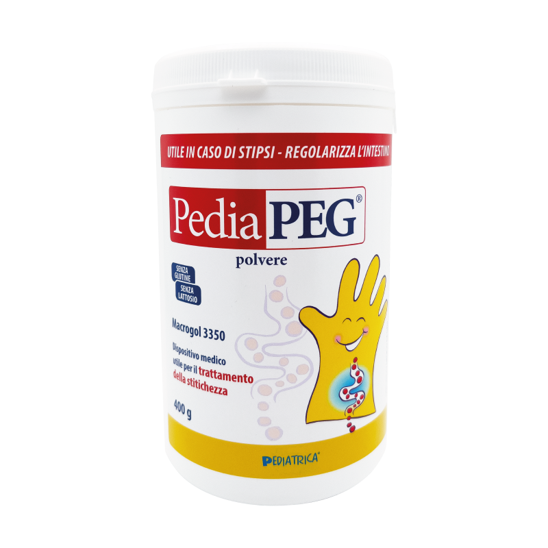 Indicazioni: PediaPEG® polvere è un dispositivo medico ad azione lassativa che, attraverso un’azione di tipo osmotico, regolarizza l’intestino in modo naturale. Non viene assorbito né fermenta nell’intestino, non irrita la mucosa e viene eliminato nelle feci in forma non modificata. PediaPEG®è particolarmente indicato nella stitichezza cronica e nei casi di intestino occasionalmente irregolare. Grazie infatti alla sua affinità per l’acqua, PediaPEG®ammorbidisce le feci facilitando l’evacuazione senza provocare crampi né dolore addominale, né condizioni di urgenza. La sua efficacia non si riduce nel tempo.